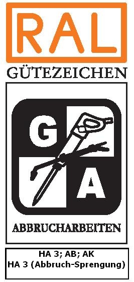 Ebenso besitzen wir das RAL-Gütezeichen Abbrucharbeiten in den Klassen: HA3 (Hochbauabbruch >20m), HA3 Abbruch-Sprengung (Bauwerkssprengung), AB (Abbruch im Bestand) und AK (Arbeiten in kontaminierten Bereichen).